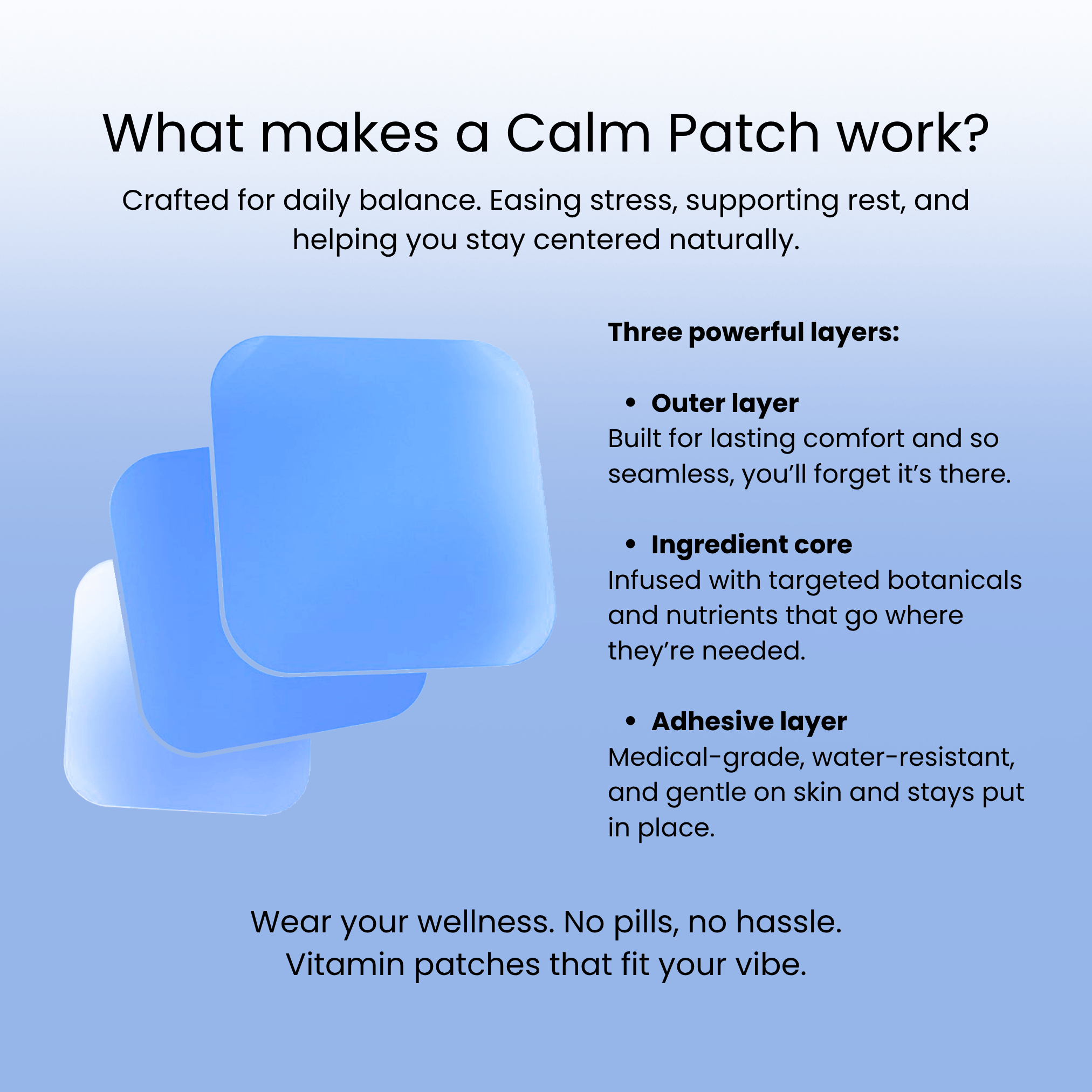 Life can get hectic—our Calm Patch helps bring balance back. This transdermal patch delivers powerful botanicals and amino acids through your skin to help soothe the body and calm the mind—naturally and effectively.
