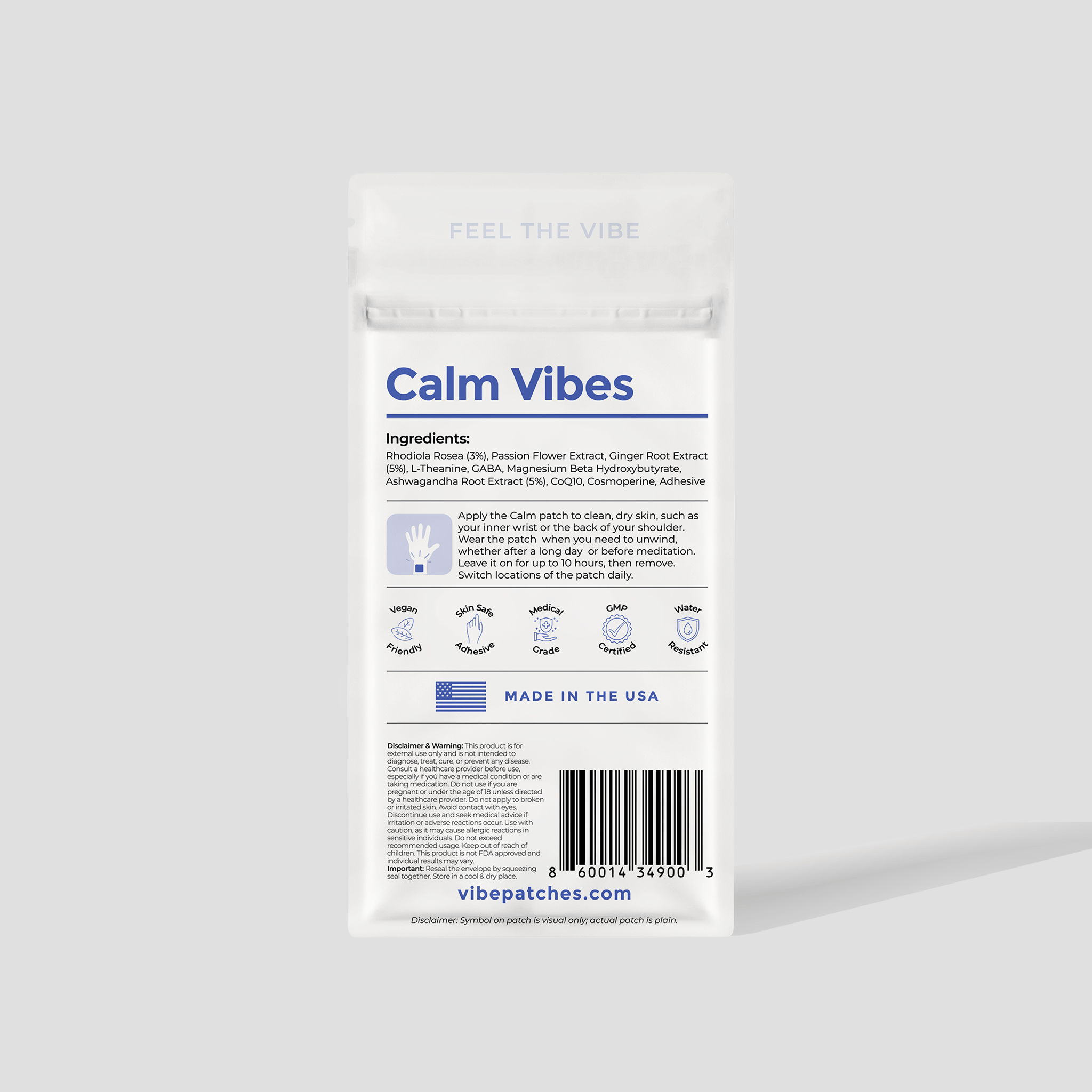 Apply the Calm Patch to clean, dry skin—ideally on your wrist or shoulder. Use anytime you need to decompress, whether after work, during travel, or before meditation.