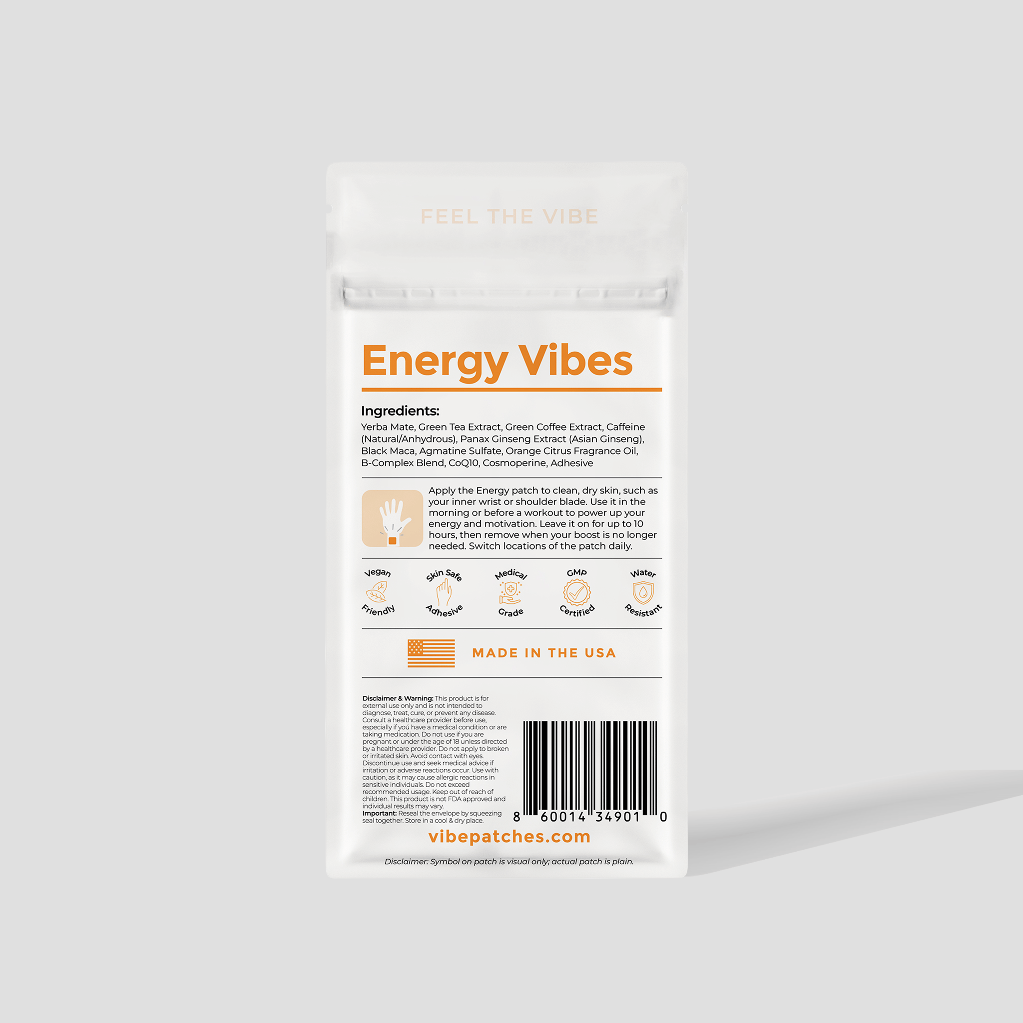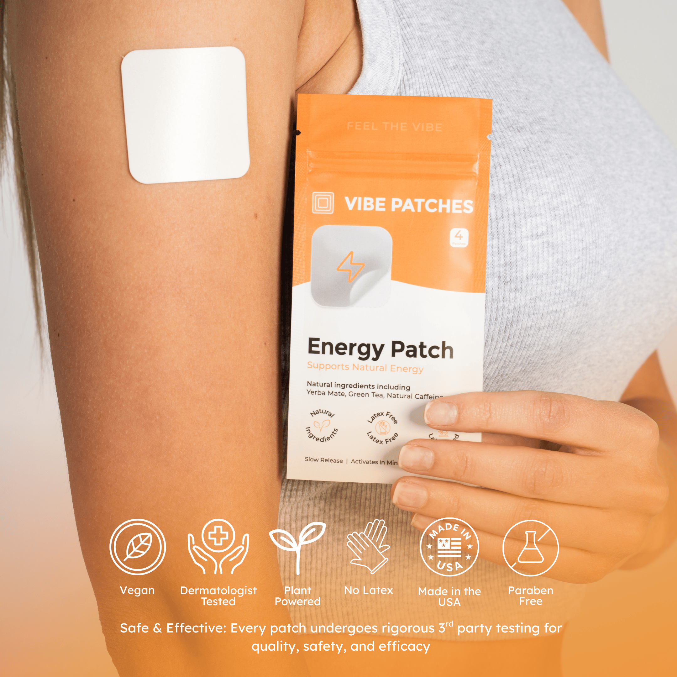 Wake up your body and mind with plant-powered energy. The Vibe Energy Patch blends Yerba Mate, Green Tea, and Natural Caffeine for smooth stamina, plus Ginseng, Maca, and B-Vitamins to support mental focus and physical endurance—without the jitters.