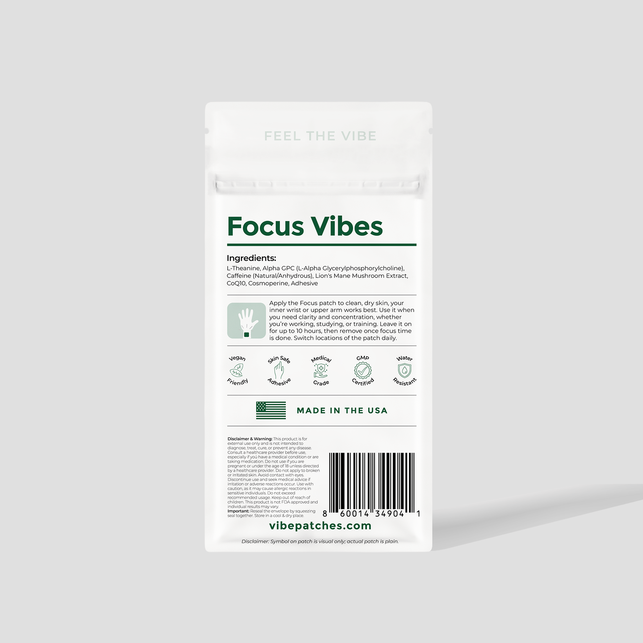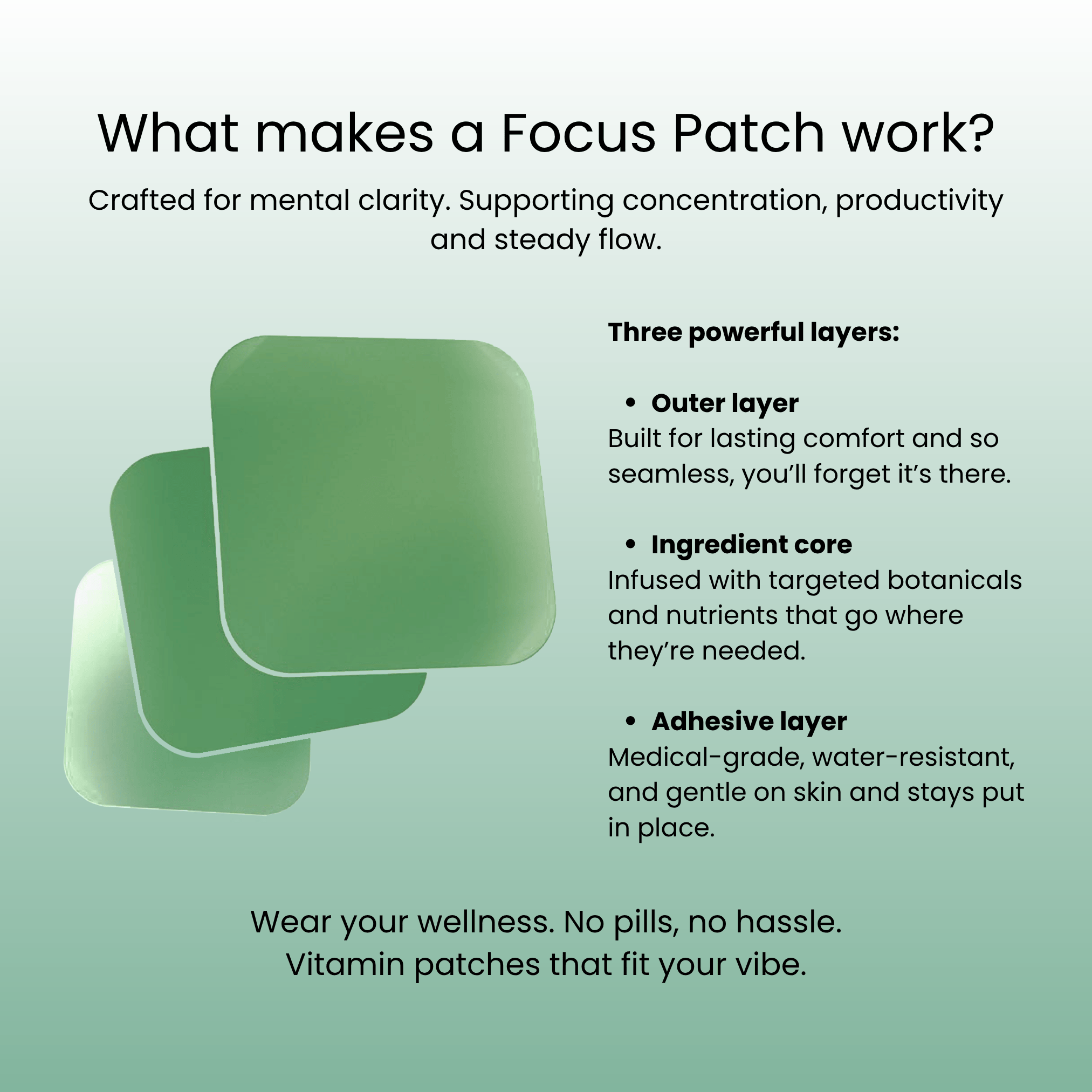 Fuel your focus without the crash. The Focus Patch delivers natural nootropics and brain-boosting compounds directly through your skin for steady, all-day clarity—no jitters, no pills.