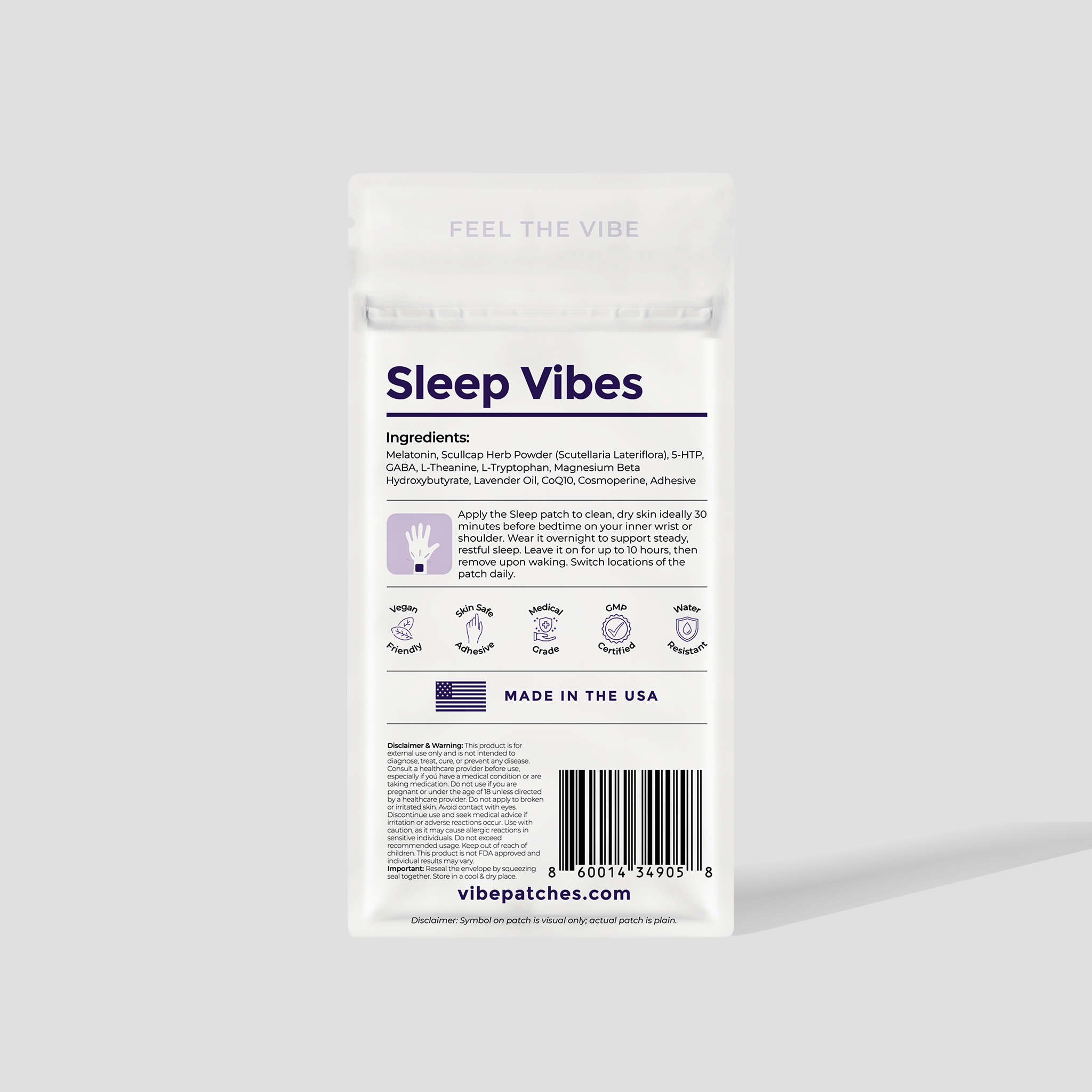 Drift off faster and stay asleep longer with the Vibe Sleep Patch. This slow-release patch combines Melatonin, GABA, L-Theanine, and calming botanicals like Scullcap and Lavender to support restful, restorative sleep—without the next-day fog.
